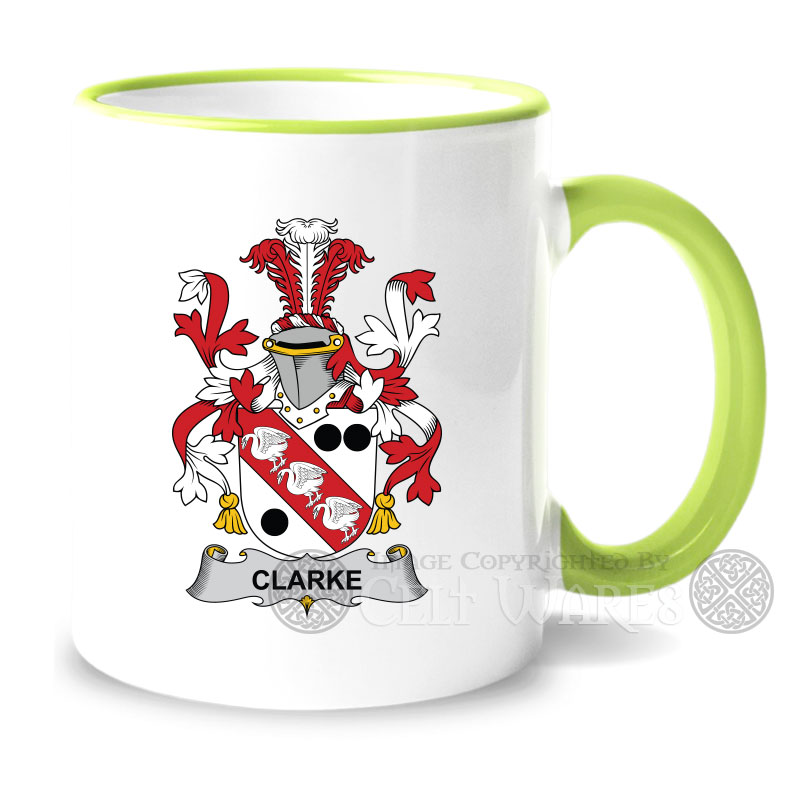An 11oz white ceramic mug, with green trim - permanently imprinted with your family's Irish Coat of Arms, in full color on both sides.