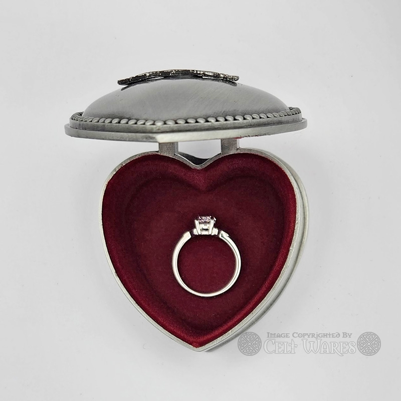 This beautiful and highly detailed heart-shaped Jewelry Box, was handmade in Ireland. The heart, of course, is the International symbol of Love, and then embossed with a traditional Claddagh, the Irish symbol for Love, Loyalty and Friendship.