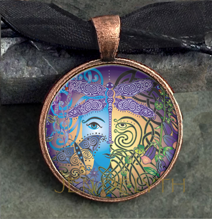 This Fairy Face pendant is a dramatic eye-catching piece of jewelry designed by a Welsh artist inspired by Celtic Mythology. The beauty of this highly detailed and colourful piece is enhanced with a glass dome.