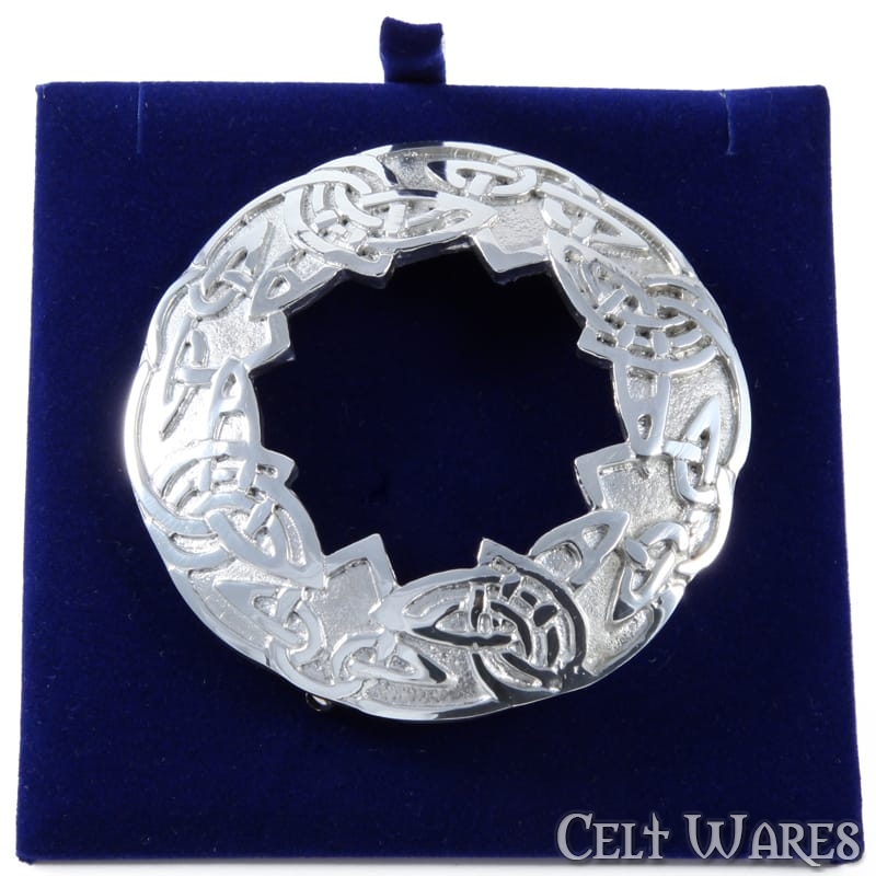 A captivating pewter brooch incorporating Celtic Knots which form a circular outer rim and a more angular design on the inside rim.