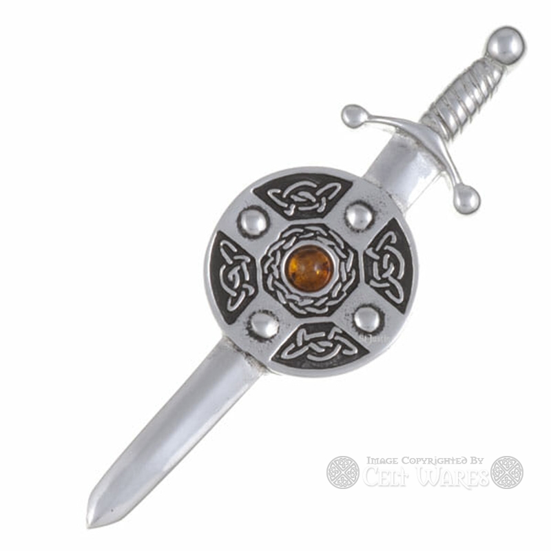 The center is embellished with amber, which in turn is encircled by another Celtic knot. Expertly handcrafted, this Kilt Pin displays a lot of detail, in a relatively small area.