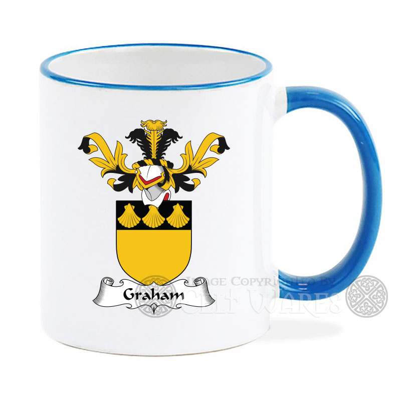 An 11oz white ceramic mug, with blue trim - permanently imprinted with your family's Scottish Coat of Arms, in full color on both sides.