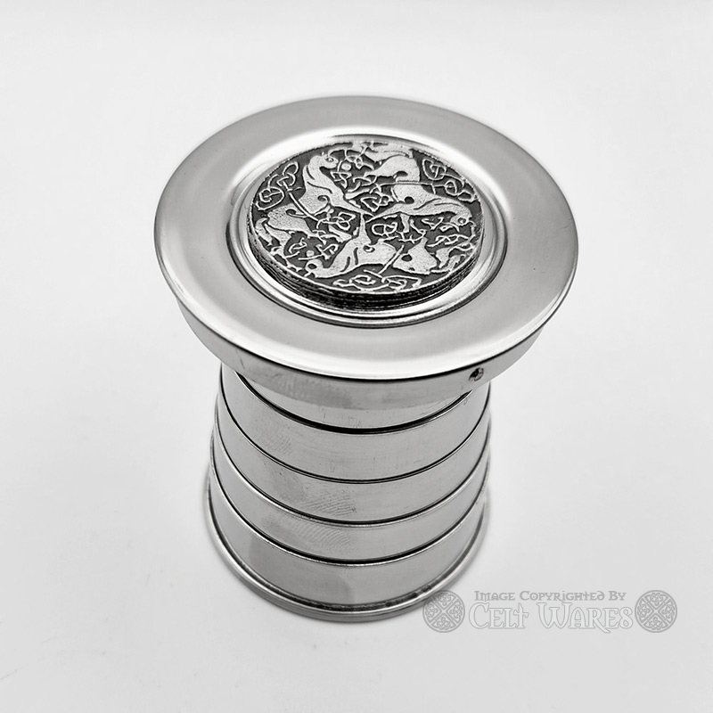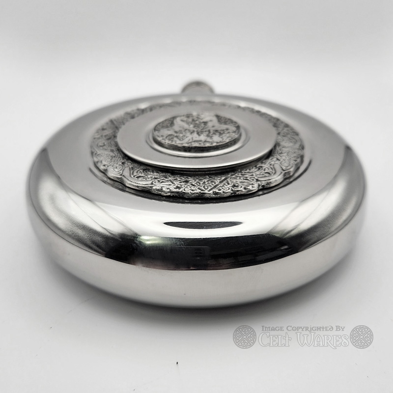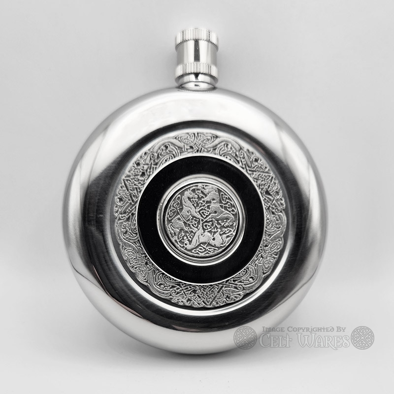 The pewter medallion adorning this stainless steel flask, is decorated with an expertly hand crafted image of Three Horses entwined in Celtic Knots. The number three (3) was very important to the Celts, so this is a powerful Celtic image.