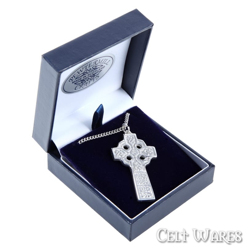 This is a sturdy beautifully crafted Pewter Celtic Cross. This handsome Celtic Cross incorporates many different Celtic Knots and Designs. It has a nice little bit of heft to it, which makes it quite popular with men or people who are hard on jewelry.