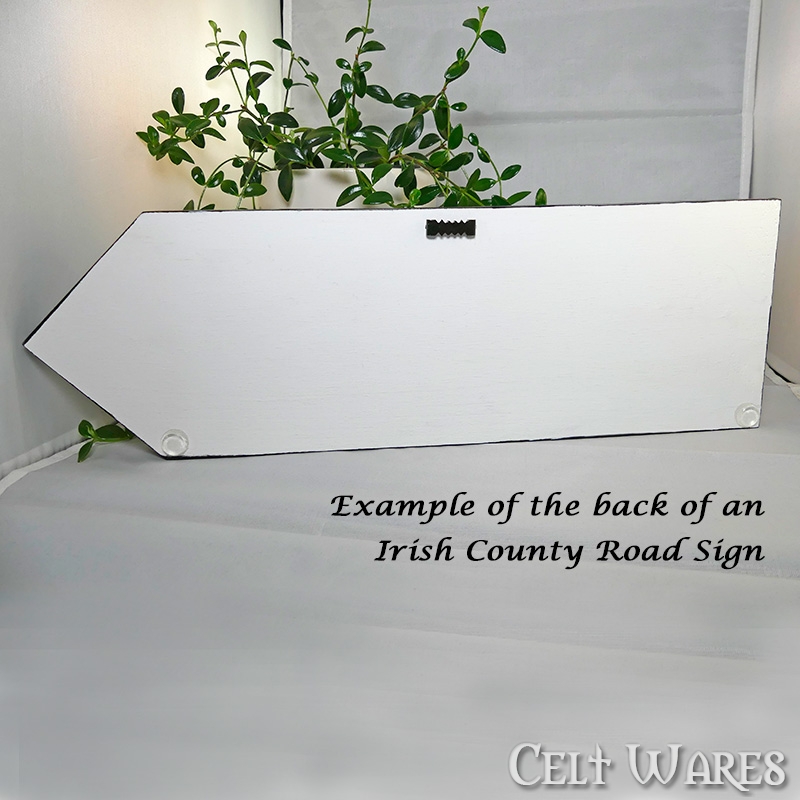 This hand crafted replica road sign, is based on the original An Roinn Iompair (Department of Transport) specifications, with raised black text on a white background, and using a faithful homage to the original ‘Irish Transport Heavy’ Font.