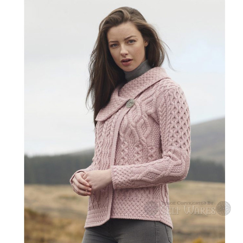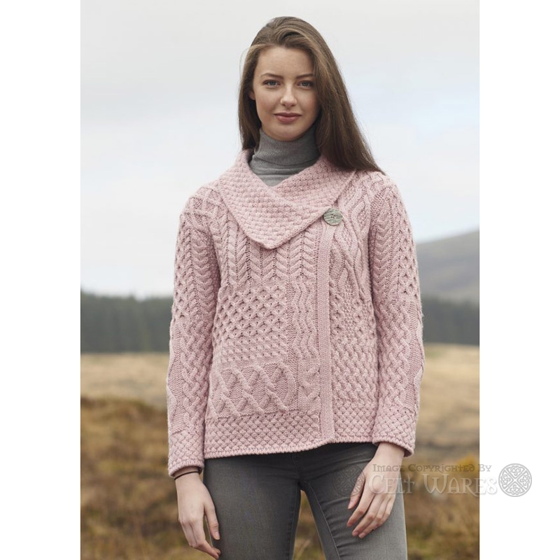 This wool cardigan is patchwork designed and made up of numerous traditional Aran patterns. The cardigan has a one button closure on the top left of the garment and also includes a hidden inside button.