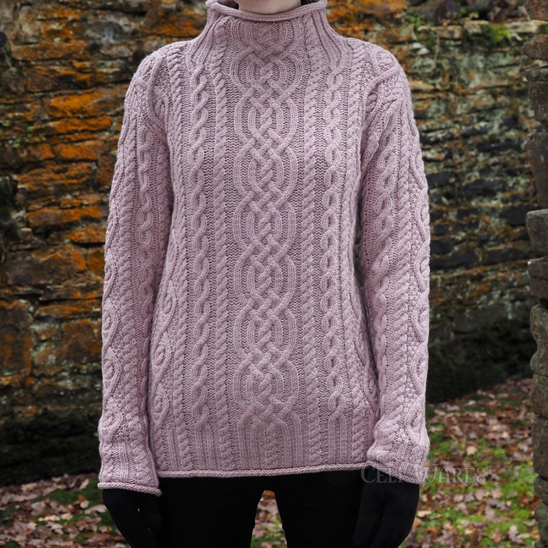This beautiful soft funnel neck sweater is a modern twist on the traditional Aran Sweater, with a curl design on the neck, sleeves and hem of the sweater.