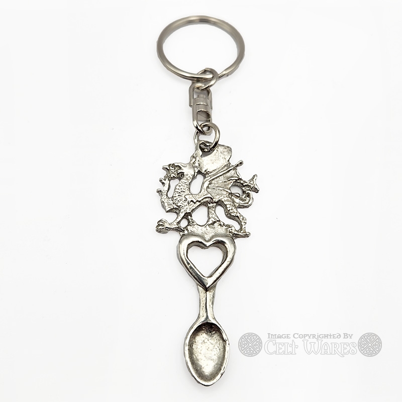 Long ago in Wales a young man would carve a lovespoon for his beloved, as a token of his love. This delightful Welsh Lovespoon keyring has the Welsh Dragon (or Griffin) topping the obligatory heart of the lovespoon. Even the hole for the keyring itself is heart shaped!