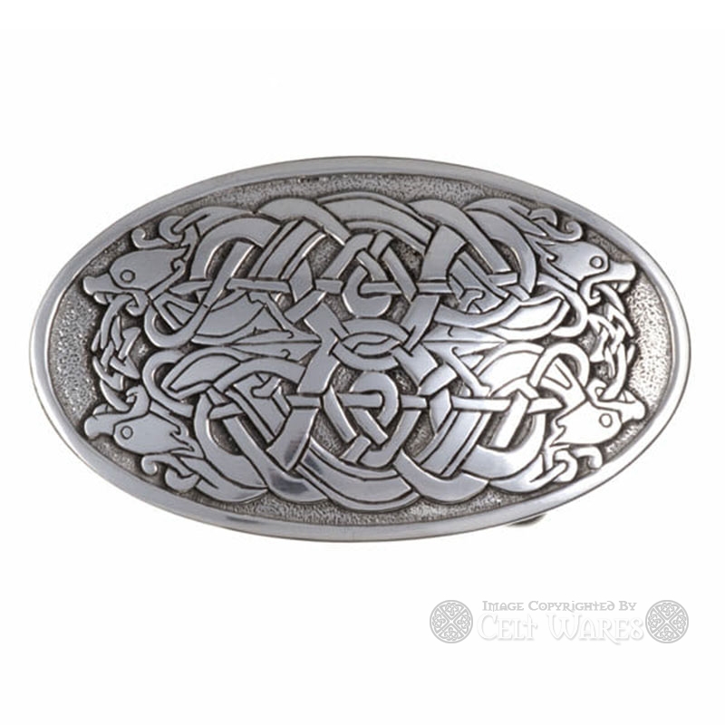 An intricate zoomorphic knot adorns this hand crafted oval belt buckle, where four hounds are interwoven into an elaborate Celtic Knot.