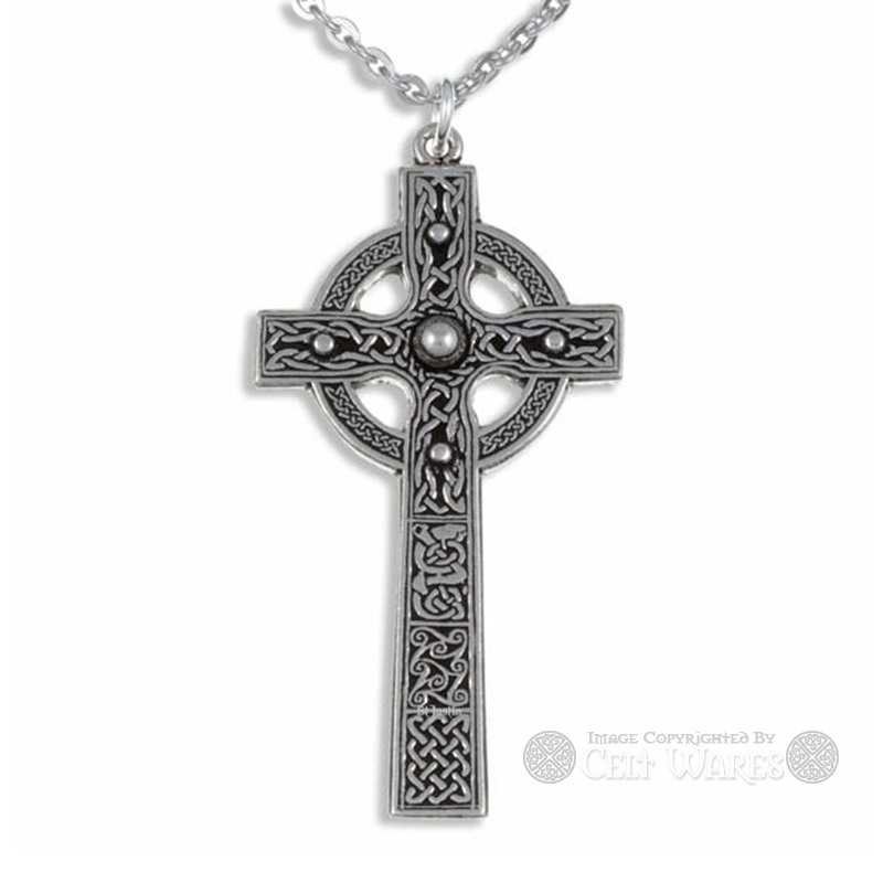 Large Cashel Celtic Cross pewter pendant expertly handcrafted and adorned with a variety of Celtic Knots. The raised domes on each arm and the center add an extra dimension.