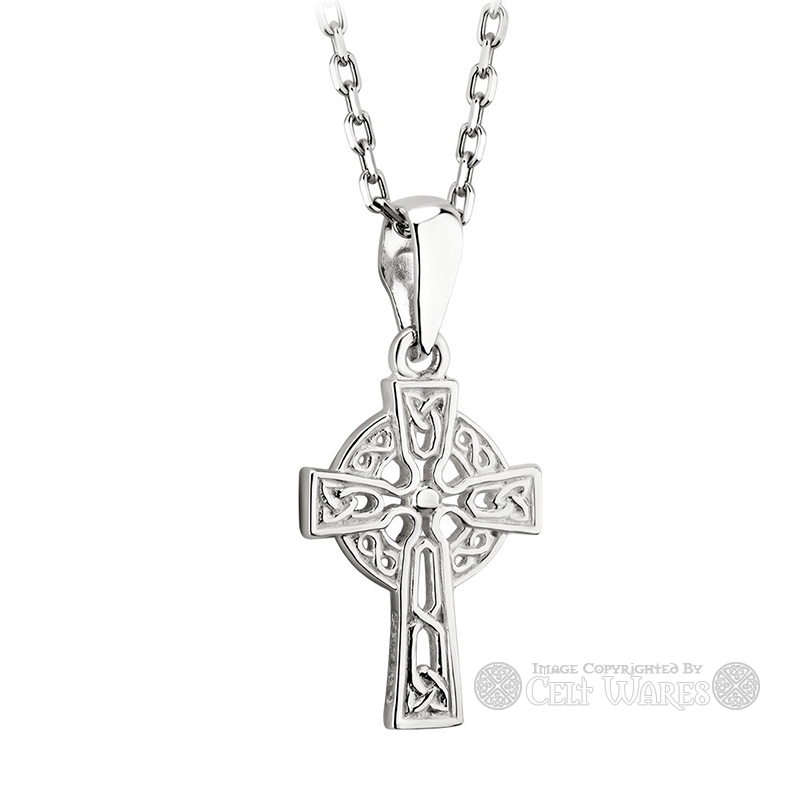This beautiful little Celtic Cross from Ireland, is made of Sterling Silver, and has been Hallmarked in Dublin Castle. Each arm of this openwork cross is adorned with a Trinity Knot.
