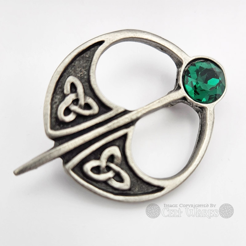 This delightful brooch is designed in an antique Tara Brooch Style, with two Trinity Knots, and a faceted green glass stone, for some added color and sparkle.