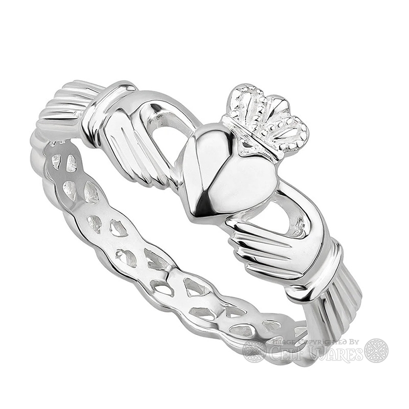 This beautiful Claddagh Ring, has a delightful band, with an expertly crafted open-work woven design.