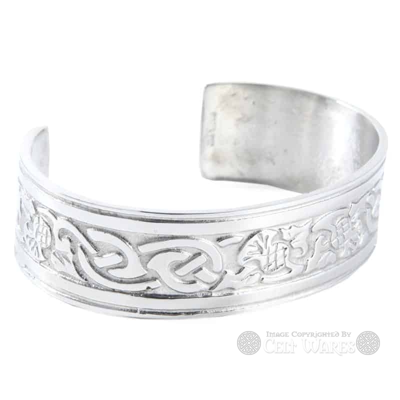 This gorgeous pewter cuff bracelet was Hand Crafted in Scotland. It features 3 sets of paired thistles, one set in the middle and one set at each end. These thistles are beautifully linked together with Celtic Knots. A delightful piece of jewelry and a lovely way to show off your Scottish Heritage.