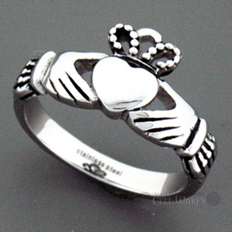This delightful example of the Claddagh ring is made from Stainless Steel, which has the beauty of silver, without the work. Stainless steel does not need to be polished, and is also a stronger metal than silver. Perfect for kids, or those who just want a sturdy ring.